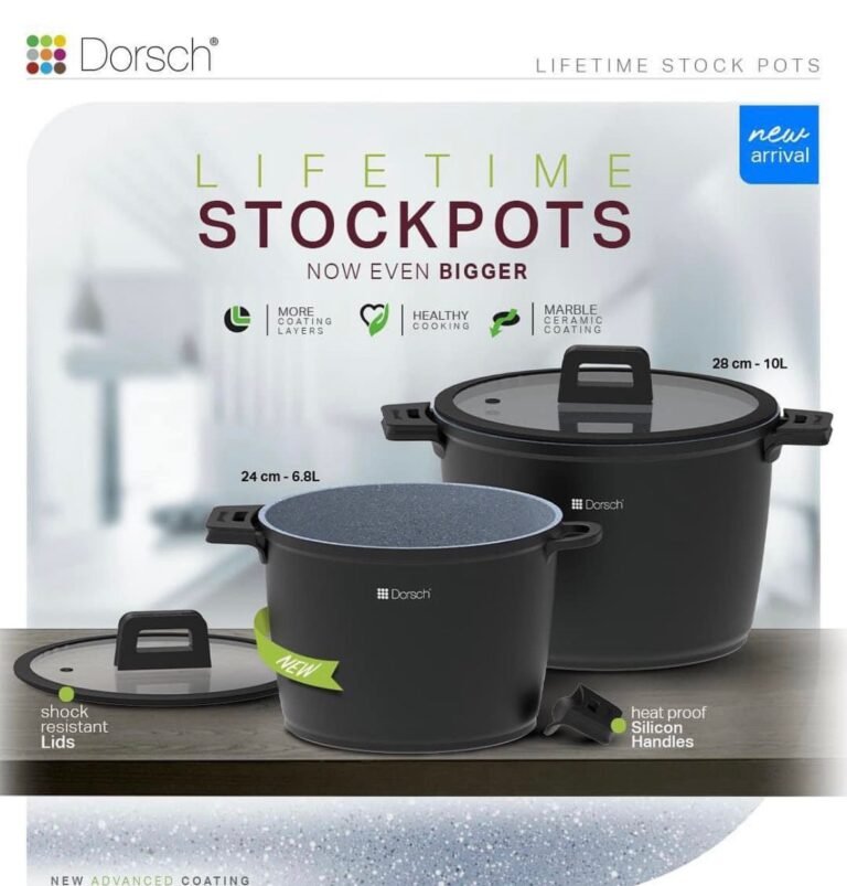 طنجرة مرتفعة 28 سم – 10 لتر أسود مغلفة بالسيراميك مع غطاء مسطح مع مسكات عازلة للحرارة – Dorsch