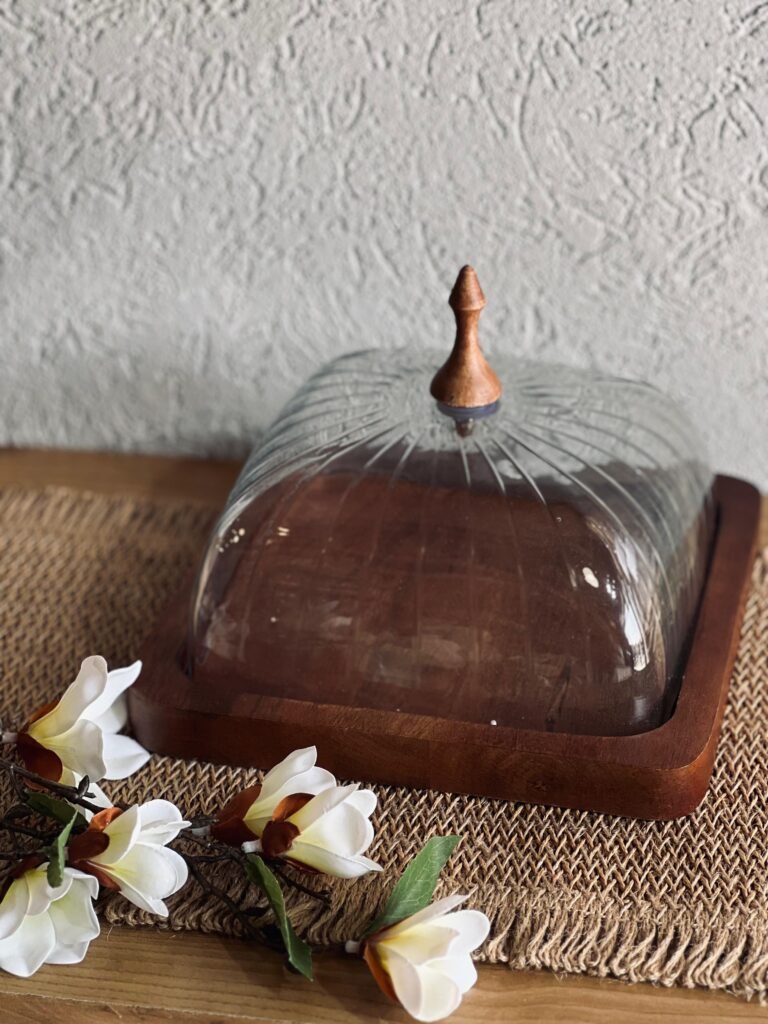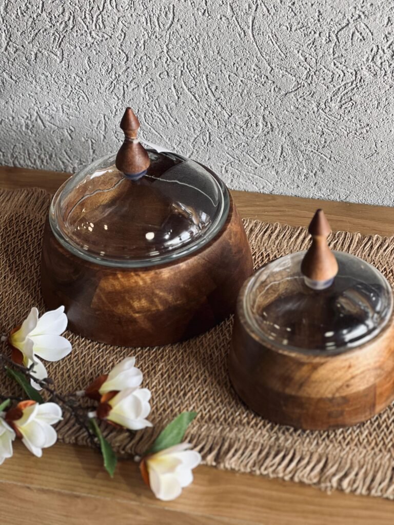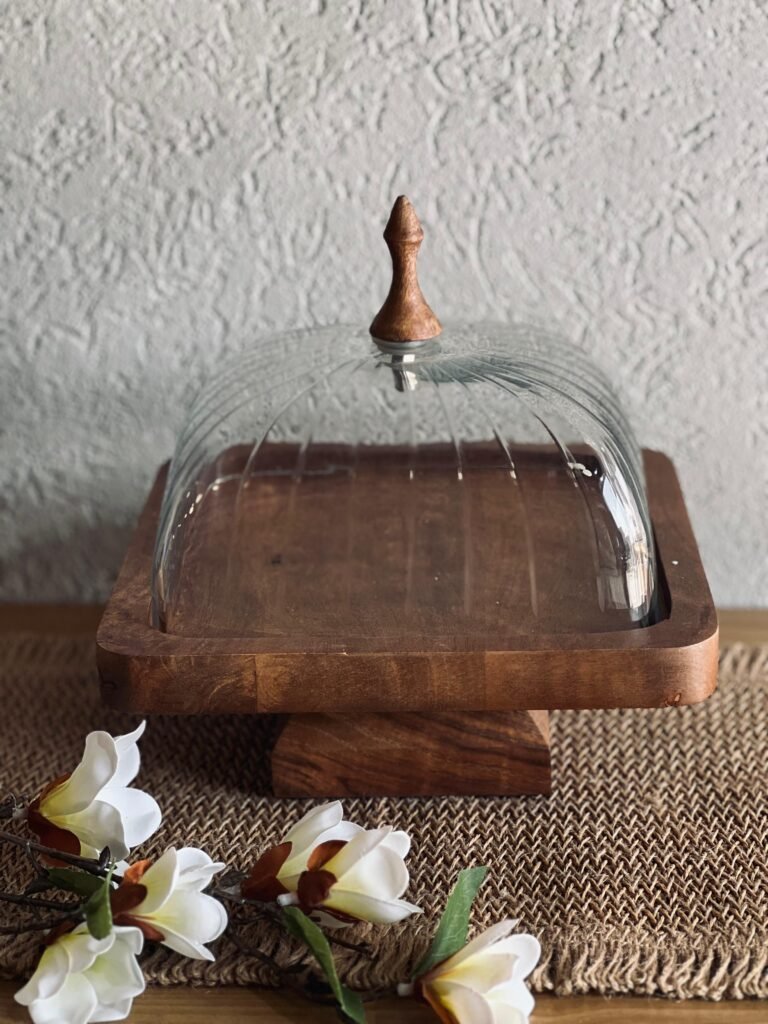 جاط حلويات خشب هندي مربع مع غطاء زجاج محزز