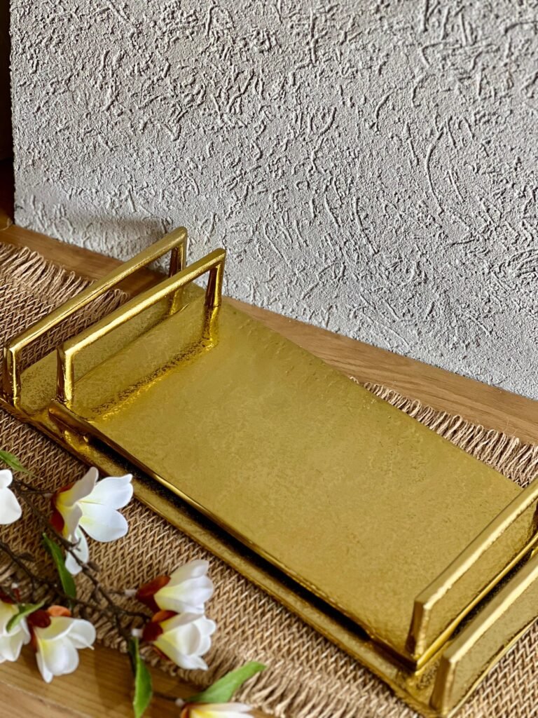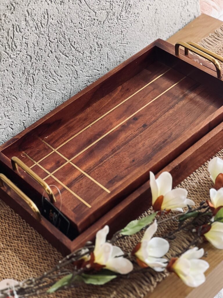 طقم صواني خشب هندي مستطيل يدين نحاس