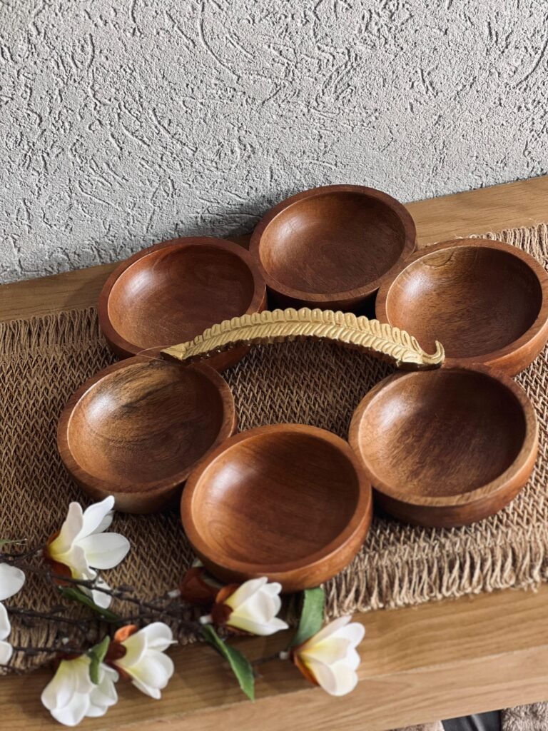 صحن مكسرات 6 عين مدور خشب هندي مع مسكة نحاس