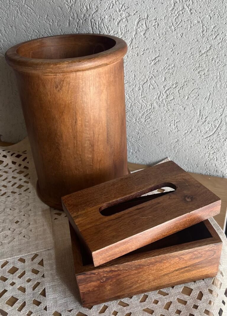 طقم سلة مع بكيت محارم مدور خشب بني هندي