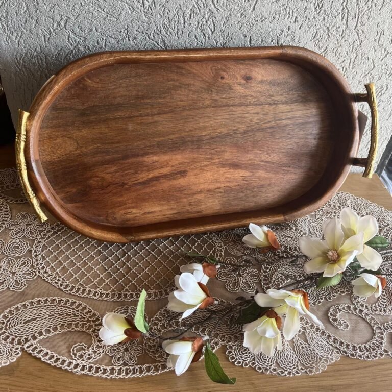 صينية خشب هندي بيضاوي مع يد جذع شجرة نحاس