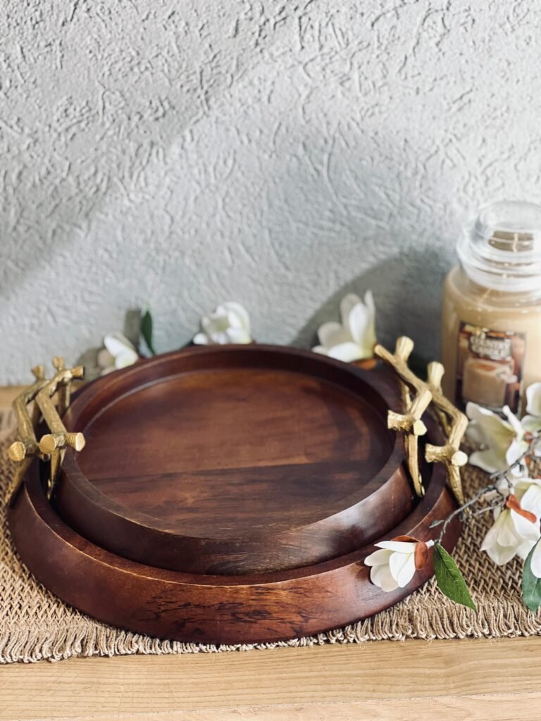 طقم صواني خشب هندي مدور مع يد نحاس