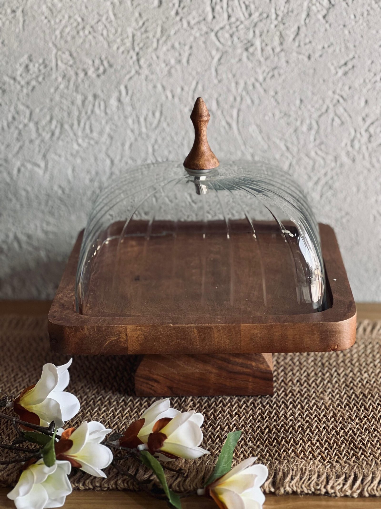 جاط حلويات خشب هندي مربع مع غطاء زجاج محزز مع قاعدة خشب