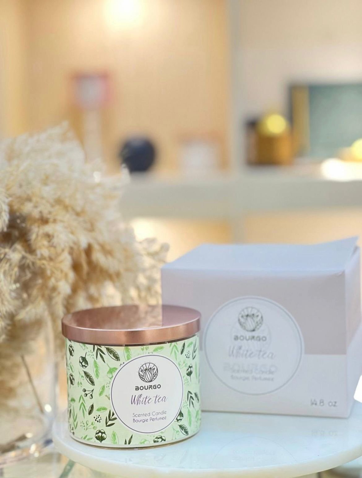 شمعة معطرة في علبة (Tin Candle) ، تُصنع الشموع غالبًا من شمع نباتي مثل شمع الصويا ومزيج من الزيوت العطرية.