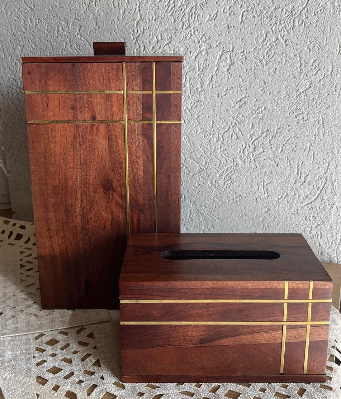 طقم سلة مع بكيت محارم مستطيل خشب هندي محزز ذهبي