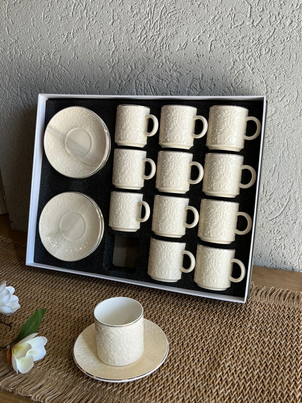 طقم فناجين قهوة 12\12 بورسلان أبيض موشح ذهبي