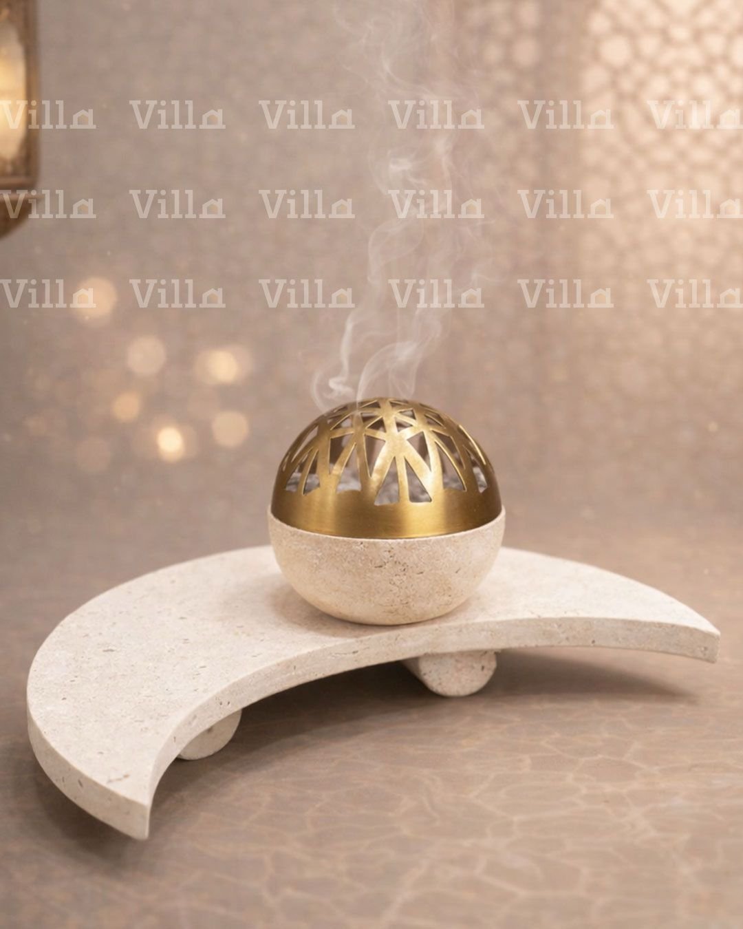 طقم مبخرة من حجر الترافرتين الطبيعي بقاعدة على شكل هلال، وكرة ذهبية من النحاس