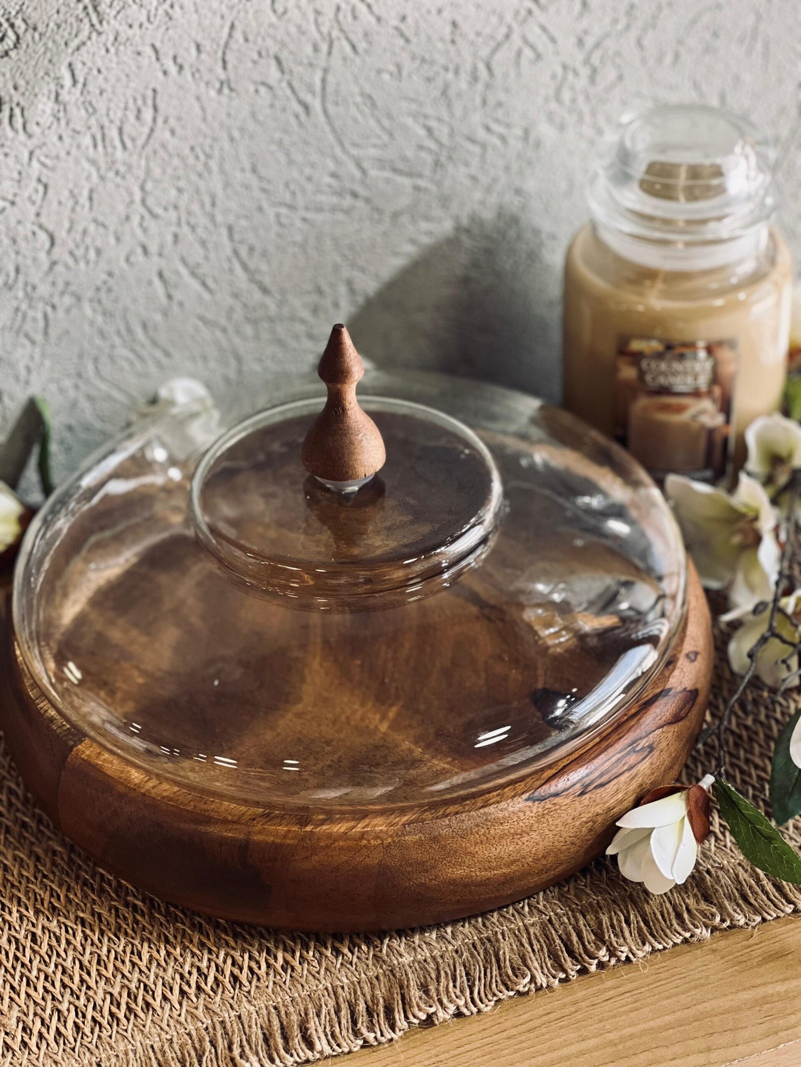 صحن كيك خشب هندي مدور مع غطاء زجاج