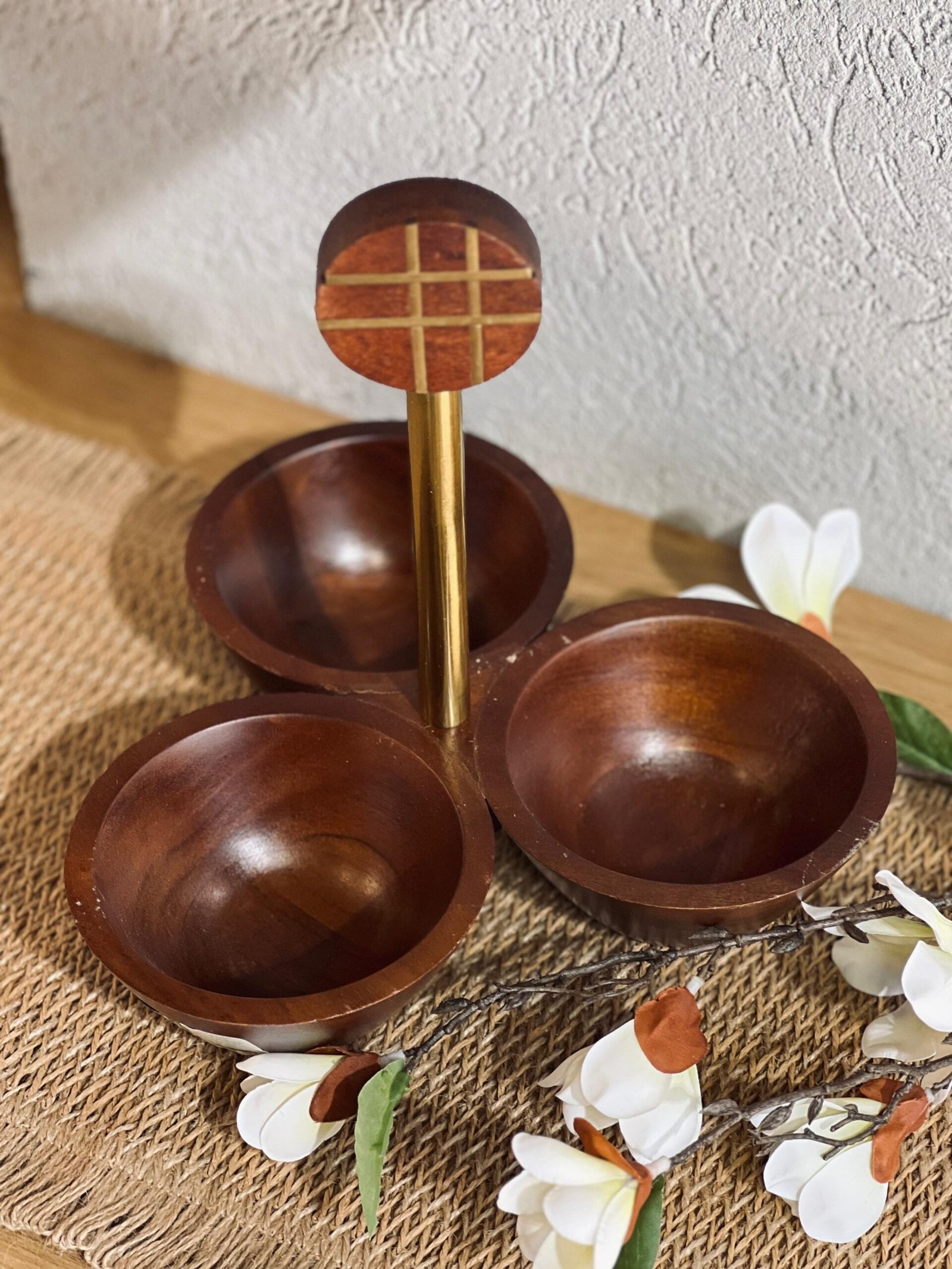 مضيفة عين خشب هندي مدور مع مسكة نحاس ذهبي